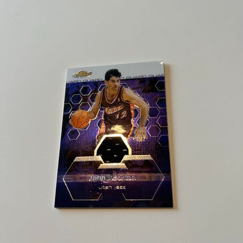 Sett med tre NBA topps chrome basketballkort av John stockton. John stockton er nba sin all time assist leader. Settet er en parallel kort , clutch gene versjon og en true green /99