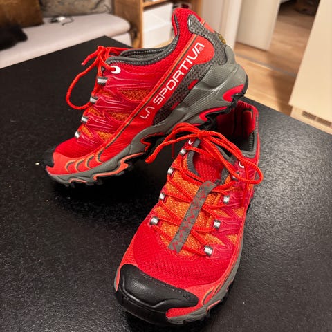 Skoa er som nye. Einaste slitasjen er at det gule La sportiva merket inni solen og merkelappen i skopløsa er litt slitt + at den venstre skoen har fått ei skrape på plastbeskyttaren bakpå hælen - sjå bilete. Denne slitasjen har ingenting å sei for bruken.