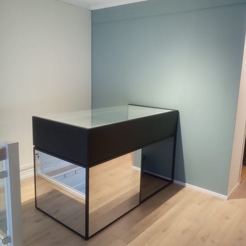 Salgsdisk, disk som har vært brukt i klesbutikk, gis bort. Skuffer og skap på baksiden, elegant disk.