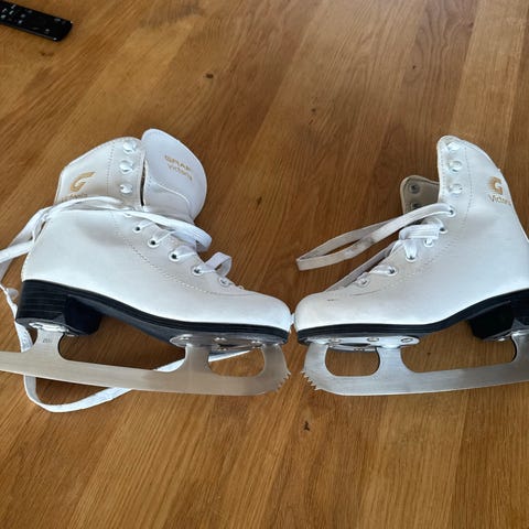 Kunstløpsskøyte til barn str 35 i hvit farge. Skøytene er laget for barn og har en klassisk design med snøring og metallklinge.