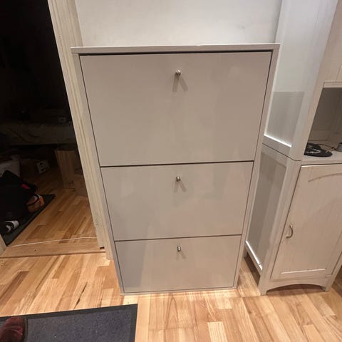 IKEA skoskap i hvit farge med fire luker. Egnet for oppbevaring av sko og småting i entré eller andre rom.