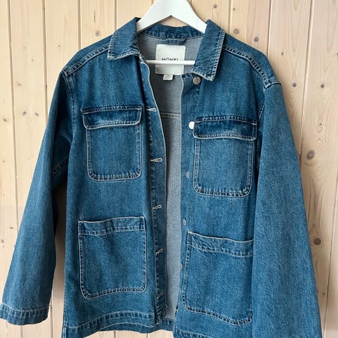 Monki denim jakke i blå farge, størrelse XL. Laget av denim materiale, designet for kvinner. Jakken har knappelukking og brystlommer.