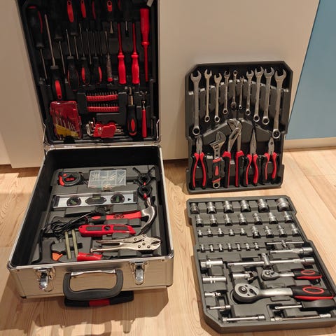 Trillekoffert full av nesten ubrukt verktøy. Mangler 2-3 deler, ellers komplett. Ikke synlig brukt.