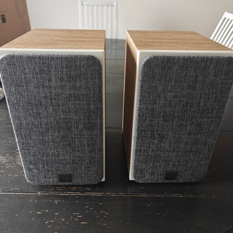 Gode kabler med plugger og dempeføtter under høyttalerene følger med.