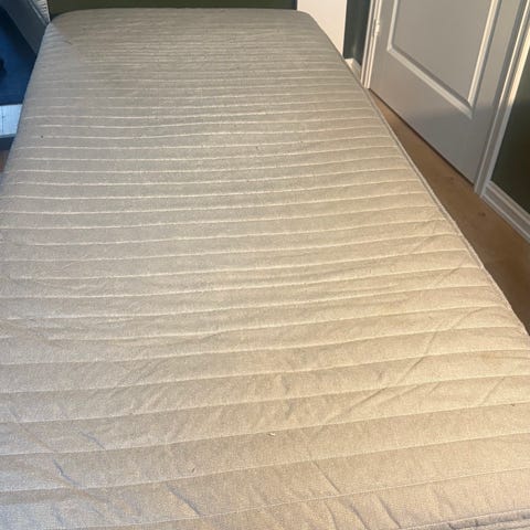 Ikea Sultan rammrmadrass gis bort mot henting. Det er inkludert med overmadrass på bildet
