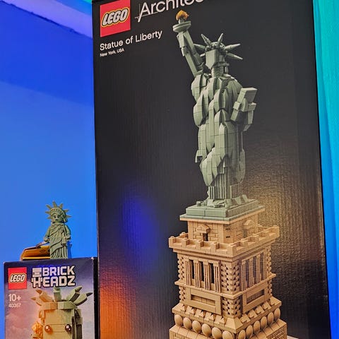 Frihetsgudinnen i karakteristisk BrickHeadz-stil.