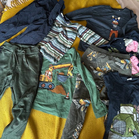 H&M barneklær for gutt i størrelse One size. Plaggene er laget av bomull og har flerfarget design med ulike motiver som dinosaurer og kjøretøy.