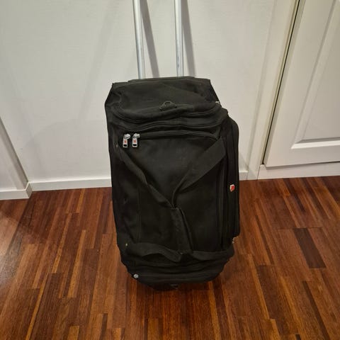 Det er en god koffert. Den har noen skrammer og et lite hull på siden av glidelåsen nederst, men håndtaket og alt annet fungerer fint. Det er best å ikke overbelaste den. Du kan lime glidelåsen nederst, så vil den vare lenge.