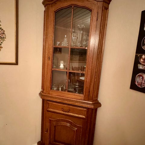 Beiset hjørneskap selges pga plassmangel. Farget glass i øvre døren. Rommer mye, 2 hyller nede og 2 oppe. Har dessverre ikke nøkkel til dørene. Målene er ca 178 høyt, 50 dypt og 83 cm bredt. Prisen kan diskuteres, må fåes vekk fra kjeller.