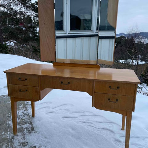 Pen, vintage kommode med fire skuffer. Opprinnelig sminkebord, men speilet er tatt av. Brukt som TV-møbel og kommode. Noen små bruksmerker, og noe slitasje.