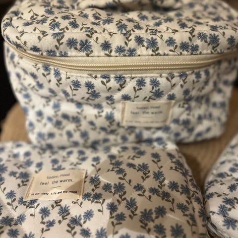 Søtt toalettmappe sett i vattert blomstrete mønster.
