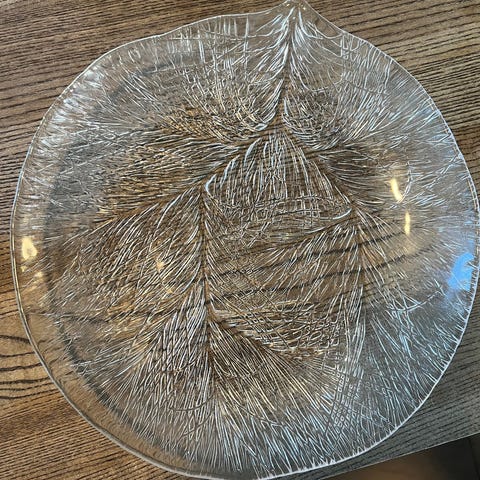 Fatet er rundt og har et dekorativt bladmønster (Aspen Leaf) i klart glass. Fatet er i veldig god stand og ingen slitasje.