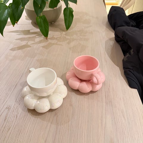 Glasskopper i sett med 6 stk, hver med kapasitet på 16 cl. Settet inkluderer matchende fat. Glassene har dekorative farger og mønstre, egnet for servering av varme drikker.