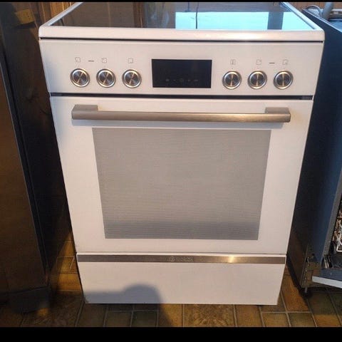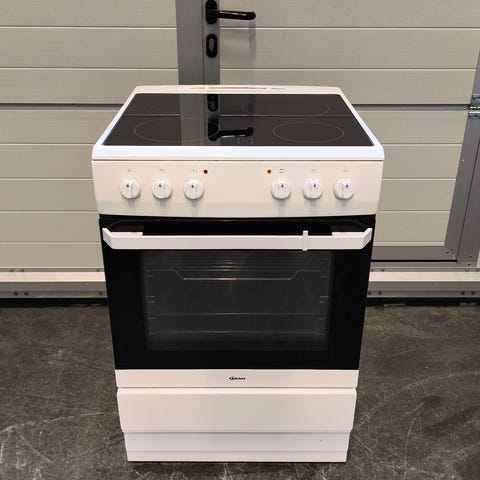 Gram keramisk komfyr med keramisk kokeplate. Komfyren har flere betjeningsknapper for regulering av varme og ovnsfunksjoner. Produktet er i hvit farge.