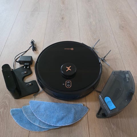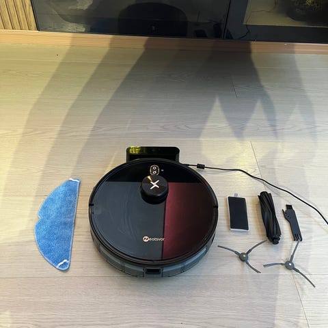 Neatsvor vaske- robotstøvsuger i svart farge. Ny monterte sidebørster og hoved børste. Inkluderer ladestasjon, ekstra sidebørster, 2 helt nye moppekluter, ekstra filter og bruksanvisning. Designet for automatisk rengjøring av gulvflater.