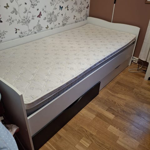 Sengen er IKEA Nordli. Plassbesparende og praktisk med 3 romslige skuffer under. Antiskli på senga så madrassen ikke sklir. Nypris 2700kr.