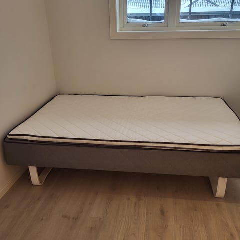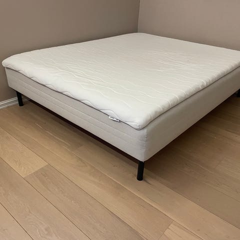 Svært pent brukt seng selges grunnet behov for større seng. Ingen flekker verken på seng, madrass eller overmadrass. Alltid brukt madrassbeskytter. Mulig å vaske trekket til både overmadrass og madrass.