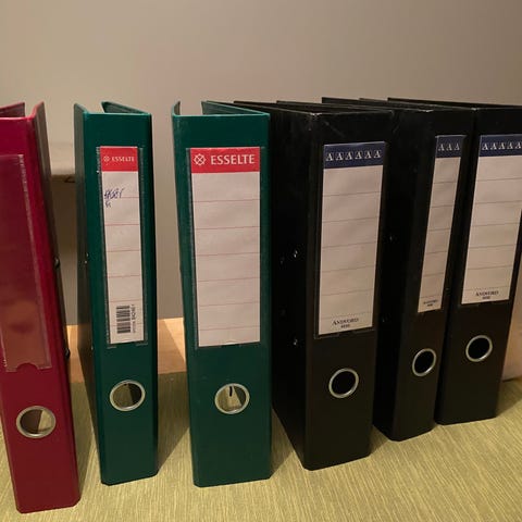 Flere ulike permer gis bort mot henting. Egnet for oppbevaring og organisering av dokumenter.