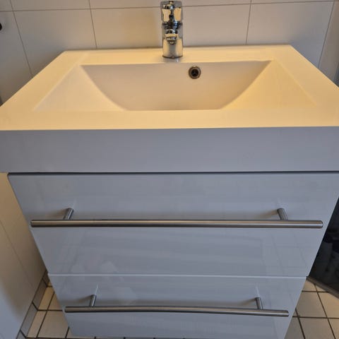 Servantskap med to skuffer og integrert vask. Servantbatteri fra Grohe. Fra 2021. Pent brukt