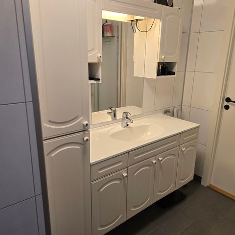 Baderomsmøbler med servant og berøringsfritt Blandebatteri: Benkeplate 215 cm innredning 130 cm