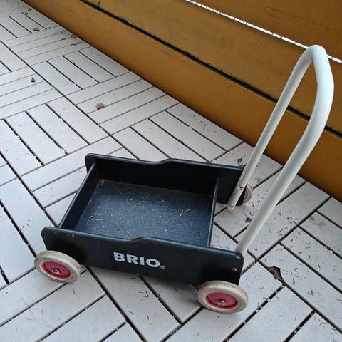 BRIO barnevogn i tre med rødt og gult. Barnevognen har hvite hjul og et håndtak i metall. Egnet som leketøy for barn.