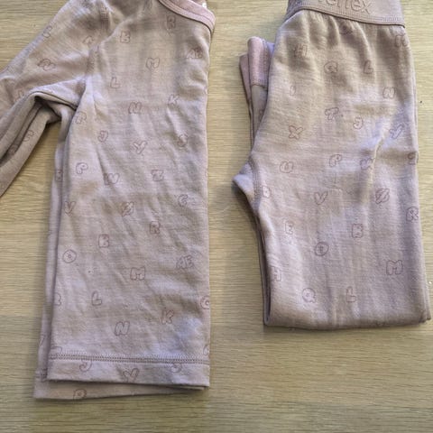 Sett i ull og bomull, 50/50. I god stand, kun litt nupper, men ingen hull. Passer størrelse 98–104.