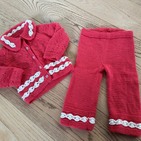 Håndstrikket sett med jakke og skjørt