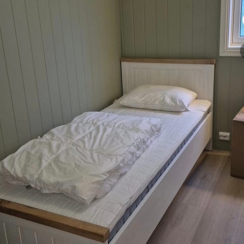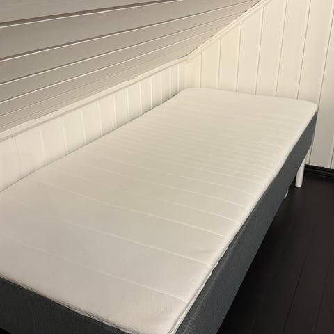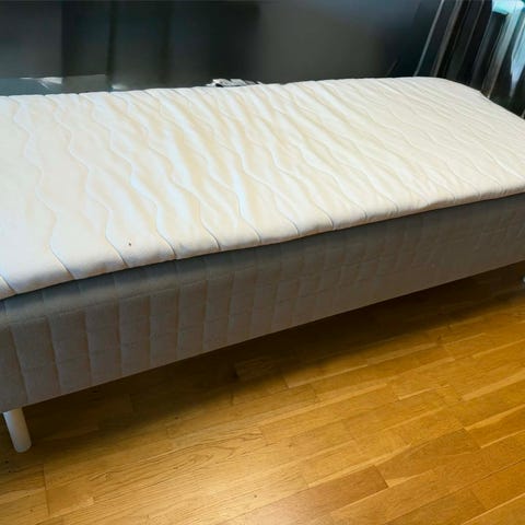 Seng på 90x200 cm med hodegavl. Overmadrassen følger med om ønskelig. Må hentes.