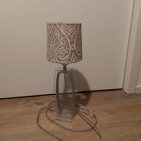 Stilren bordlampe med matt hvitt glass og base i børstet stål. Gir mykt og behagelig lys. Diameter ca. 25 cm, høyde ca. 27 cm. Pent brukt og i god stand.