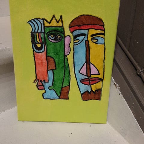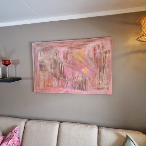 Abstrakt maleri på lerret med fargerikt motiv i ulike nyanser som blått, lilla, oransje og grønt. Passer til dekorasjon i hjem eller kontor.