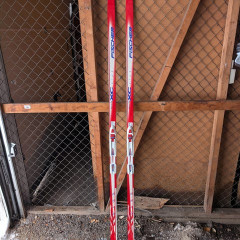 Fischer langrennsski twin skin sprint og tilhørende bindinger og staver. 150 cm, med standard bindinger (justerbare) fra Fischer. 115 cm staver fra Swix. Fellene er godt brukt men nyrenset, og bør holde et par sesonger til. Ellers er det mulig å bytte feller på sportsbutikk. Må hentes i Drammen.