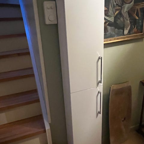 Høyskap for vegg, innfesting for vegg følger med. Høyde 172cm, bredde 40, dybde 25.