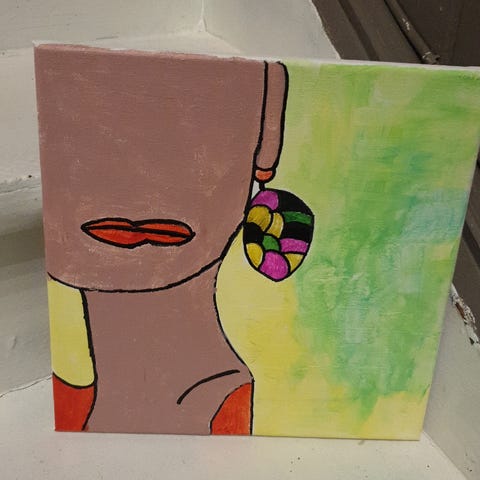 Maleri med abstrakt ansikt i flere farger, inkludert rødt, blått, gult og svart. Passer til dekorasjon og kunstsamling.