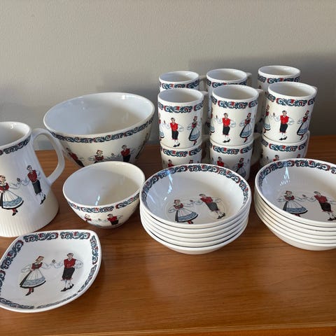 Selges via Finn. Jeg driver også nettbutikken PrelovedbyM og håndplukker vintage serviser og interiør.