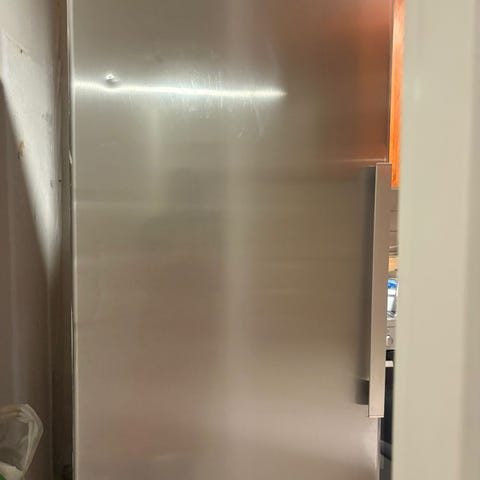 Electrolux kombiskap med fryser i bunn. Kjøleskap med flere hyller og skuffer for oppbevaring. Rustfritt stål utvendig. Fungerer fint, står ute frem til det blir hentet.