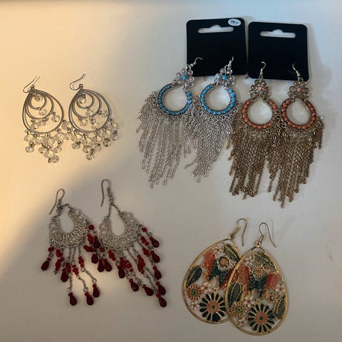 H&M øredobber for dame laget av plast og stål. Settet inneholder flere par med forskjellige farger og mønstre, inkludert gule og røde gresskarformer samt hvite med svarte prikker. Passer til daglig bruk og ulike anledninger.