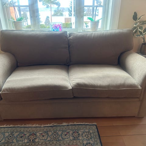 Sofa i grått stoffmateriale. Tre seter med myke puter og avrundede armlener. Ukjent merke.