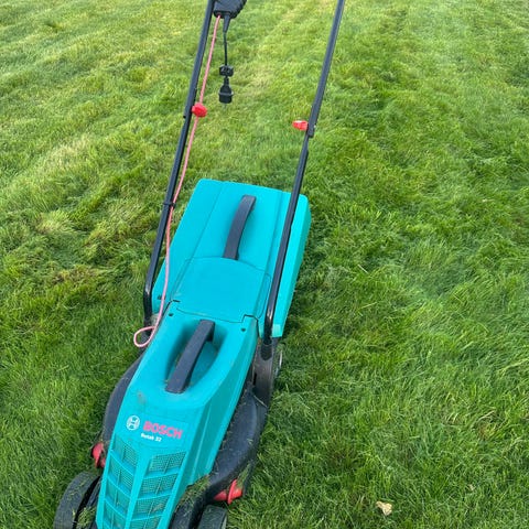 Flymo elektrisk plenklipper med 32 cm klippebredde. Utstyrt med oppsamler for gress og sammenleggbar håndtak for enkel oppbevaring. Egnet for mindre til mellomstore plener.