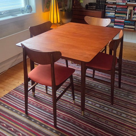 Retro spisestuestoler i teak. De har blitt trukket om i ullstoff.