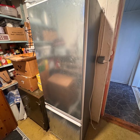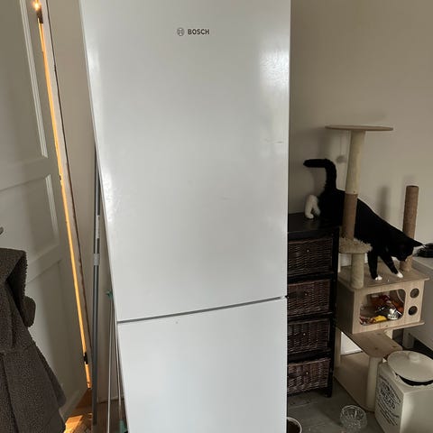 Hvitt design med separate dører for kjøleskap og fryser. Passer for oppbevaring av matvarer som krever kjøling og frysing. Er merke av tusj på fronten som ikke går helt av. Men fungerer som den skal