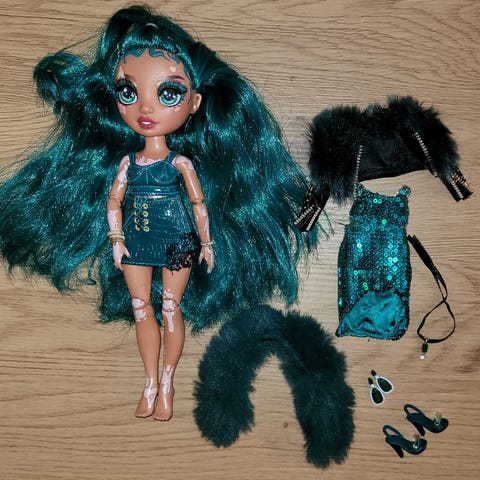 Selger denne vakre dukken med 4 plagg og et kort.