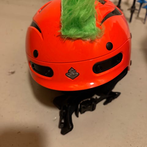 Svart Marker skihjelm med rød mohawk (kan fjernes). Hjelmen er justerbar i nakken og hakestropp. Har ventilasjon. Passer til barn ca 3-5 år