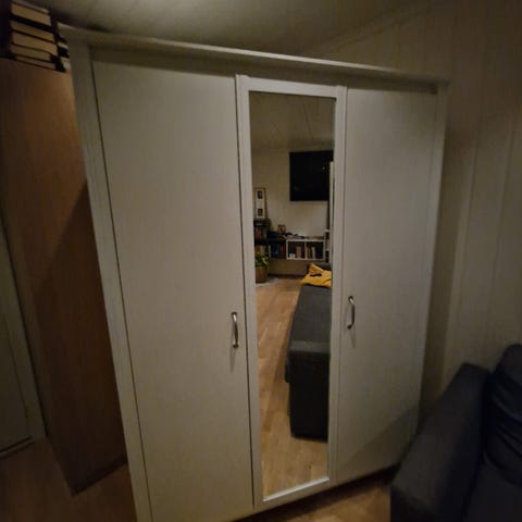 Stort og fint skap. Henging, med en hylle over, i hele, pluss tre skuffer. En skuff er ikke helt som den skal, men er nok lett å fikse