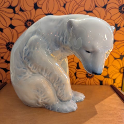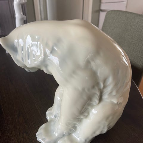 Porsgrund Isbjørn i porselen. Figurfremstilling av en isbjørn i sittende posisjon, laget i hvitt porselen. Passer som dekorativ gjenstand.