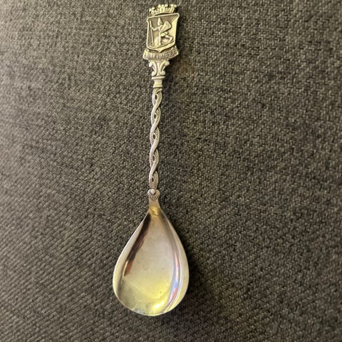 Souvenir skje fra Lillehammer, i sølvplett 40 gr, selges kr 150,-