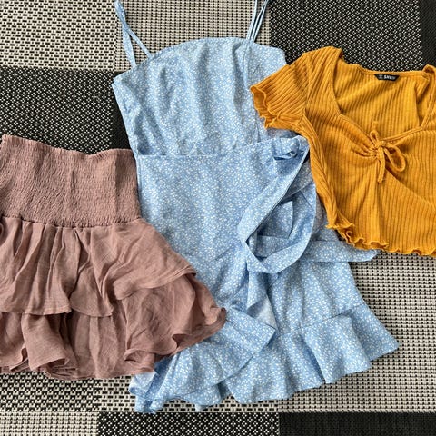 En tettsittende kjole med justering på ene siden, en løstsittende kjole og en topp. Vero Moda og Cubus.