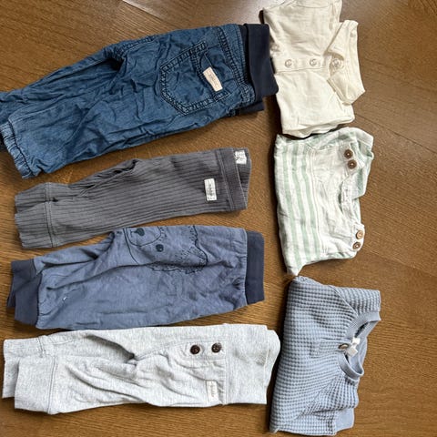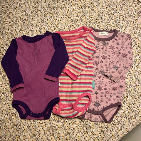 Fin klespakke, det meste er Newbie utenom 3 bodyer bak den rød shortsen, de bodyene står det 68 men små i strl og tilsvarer en 62. og stripite "heldress" er 68. Hvit Newbie body har en flekk/skygge se bilde. Eller pent og svært lite brukt!☺️