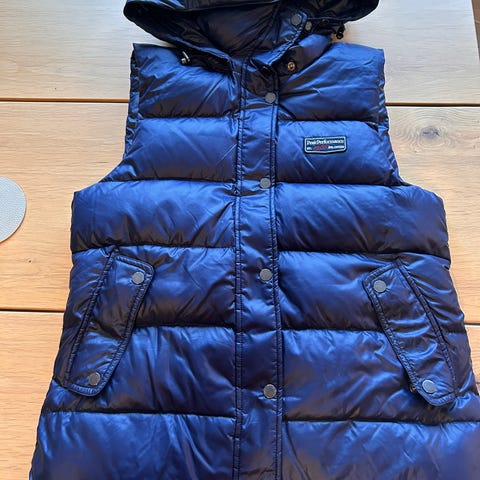 Peak Performance Faye Down vest i størrelse S for kvinner. Vesten er svart. Den er designet for utendørs bruk og har dunfyll for isolasjon.