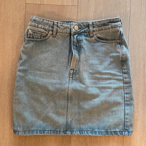 Denimskjørt fra Gina tricot i xs. Lys blå farge. Åpnes med knapp og glidelås. Sitter veldig fint på.