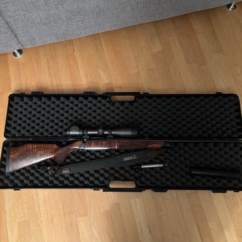 Meget pen og lite brukt Sauer Take Down Excellense selges i kaliber 300 Win mag og 375 HH. Selges med kikkersikte Swarowski Habitach 2,5-10×56, Hausken lyddemper SD228 kal.30 og orginal Sauer koffert.
